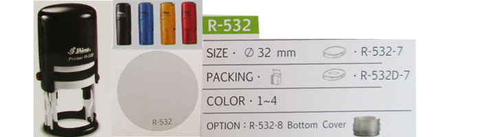 Mộc dấu tròn Shiny R532 có đường kính 32mm, sử dụng tăm bông R532-7, tăm bông có sẵn đi kèm với từng con dấu.